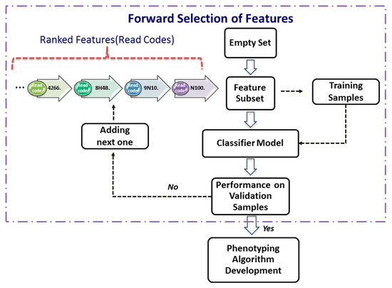 Different from the expert-knowledge-driven methods, AI- and machine-learning-based, data-driven methods offer a promising application in improving diagnostic performance [13,14]. In this paper, we propose to use a transparent machine-learning framework to mine EHRs for automatic phenotype identification by parsimonious set of useful clinical signals. The proposed methodology is grounded in the theory and methods of text mining [15]. Each patient is treated as a document consisting of coded terms and other variables (words); prediction of health outcomes for each patient is thus treated as a problem of text categorisation. One efficient way of representing words in vector space is to embed words in a latent factor vector space [16,17]. Although latent representation of words may significantly improve performance of word classification, it is difficult or impossible to know the logic involved about relationships between the raw words and the outcome. As the General Data Protection Regulation (GDPR) [18] takes effect, data subjects have the right to have meaningful information about the logic involved and the envisaged consequences of such automated decision making for the data subject. It is of pressing importance to develop transparent data-driven models that have explanatory power. This is essential in order for machine-learning-based tools to be sufficiently trusted by medical community in modifying protocols for diagnosis and treatment. Therefore, in this paper, we directly work on raw words rather than their latent representations by integrating data-mining techniques to offer a transparent disease-phenotyping framework that generates decision rules with clear inferencing logic involved about relationships between clinical concepts and health outcome. To reduce the large number of raw words to the minimum combination of features able to phenotype a condition and with each feature representing a single EHR within a patient’s medical history, feature selection (FS) is used to score and rank the clinical codes (terms) so that only the most relevant codes are kept.