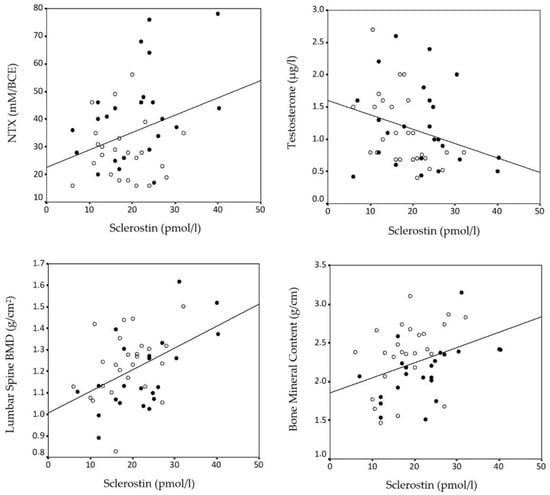 Bivariate correlation analysis between sclerostin levels (pmol/L) and NTX levels (mM/BCE), testosterone levels (µg/L), Lumbar Spine BMD (g/cm2) and BMC (g/cm) in premenopausal (open circles) and postmenopausal obese women (closed circles).