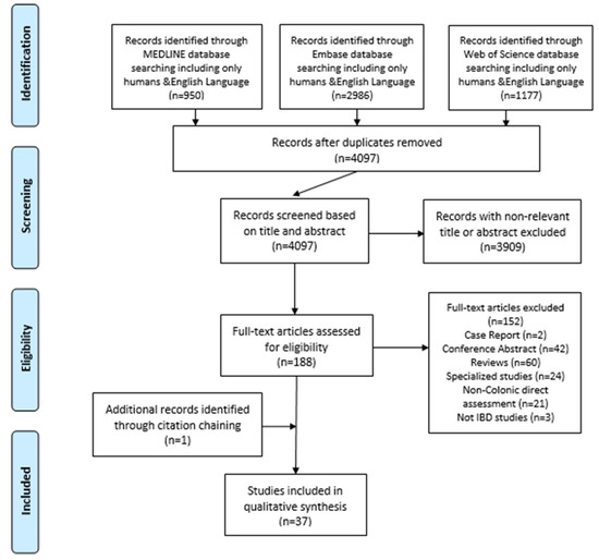 A systematic literature review was undertaken to investigate the diagnostic accuracy of non-invasive colonic imaging in both CD and UC. The preferred reporting items for systematic reviews and meta-analyses (PRISMA) [10] guidelines were followed. The search strategy was based on the patients, intervention, comparator, and outcomes (PICO) framework model [11] (Table 1), and is summarized in Table S1 (Supplementary Materials) together with the search terms. The search was conducted through three different databases: Embase, MEDLINE, and the Web of Science, which were searched from inception to 20 September 2021. To avoid missing relevant references that might be excluded from the search results in some databases, additional related studies from citation chaining of reviews and meta-analysis were identified, and manually included.