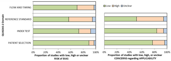 QUADAS-2 assessment of bias and applicability (graphical summary).
