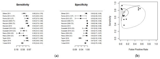 The diagnostic performance of MRI studies is presented in Table 2. Ileo-colonoscopy was used as a reference standard in 11 studies and histopathology in 2 studies. Diagnostic accuracy was investigated in CD in 11 studies and in UC in 2 studies. The performance estimates of MRI are depicted in a Forest plot (Figure 3a), with related summary receiver operating characteristic (ROC) curves (Figure 3b). The estimated mean sensitivity of the 13 combined studies was 0.75 (0.65; 0.83), whereas the specificity was 0.91 (0.83; 0.95). The area under the ROC curve (AUC) was 0.88 (95% CI, 0.82 to 0.93). The diagnostic odds ratio of each MRI study is shown in Figure S1a (Supplementary Materials).
