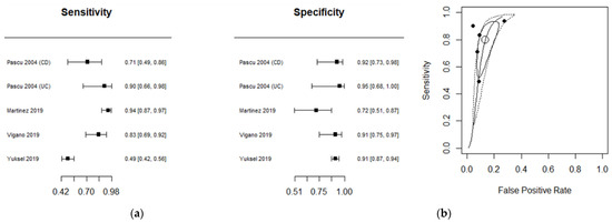 The diagnostic performance of US studies is presented in (Table 3). Ileo-colonoscopy was used as a reference standard in four studies and histopathology in a single study. Diagnostic accuracy was investigated in CD in four studies and in UC in a single study. The performance estimates of US are depicted in a Forest plot (Figure 4a), with related summary ROC curves (Figure 4b). The estimated mean sensitivity based on the five combined studies was 0.82 (0.62; 0.92), whereas the specificity was 0.90 (0.87; 0.93). The area under the ROC curve was 0.9 (95% CI, 0.75 to 1.00). The diagnostic odds ratio of each US study is shown in Figure S1b (Supplementary Materials).