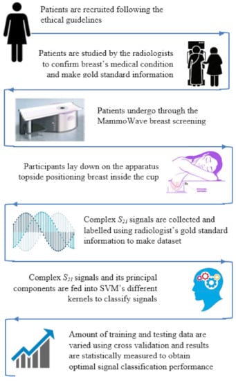 Microwave-based techniques have recently been developed as a potential breast screening tool [9,10,11,12]. Microwave-based techniques are non-ionizing, non-invasive, and painless since they do not involve breast compression during screening. Microwave-based systems utilize the contrast in dielectric properties, i.e., permittivity and conductivity, within the spectrum of microwave frequencies (i.e., approximately in the range of 1 and 10 GHz) between healthy tissues and tissues with lesions. A high difference in one or both dielectric properties (up to 5) [13] stated between healthy tissues and tissues with lesions; newer studies confirm such high contrast exists between fatty breast tissues and lesions (WF), while it declines when considering fibro glandular breast tissues [14,15]. Wide-ranging research on microwave-based procedures began in the late 1990’s, with a number of different prototypes developed [16]. Hitherto, few clinically tested microwave breast imaging operational systems have been reported in the literature, which was developed by Dartmouth College, USA [17], the University of Bristol, UK, jointly with Micrima Limited, UK [18,19,20], UBT Srl, Italy [21], University of Calgary, CA, [22,23], Southern University of Science and Technology, China [24], Hiroshima University, Japan, [25], McGill University, Canada [26], and Shizuoka University, Japan [27]. Only two of the aforementioned systems methods have now cleared a regulatory path (CE marking), i.e., MARIA (Micrima Limited, UK) and MammoWave® (UBT Srl, Perugia, Italy). One of these models, the MARIA system, utilizes an array of 60 antennas (operating within the 3–8 GHz frequency band) and a matching liquid to perform the radar approach with a sensitivity of 76% [18,19,20]. MammoWave is uniquely skilled to work in the air with two antennas rotating in the azimuth plane, operates within the frequency band of 1–9 GHz. MammoWave examinations are performed in a multi-bistatic fashion, measuring the complex in the frequency domain. In more detail, the device transmits non-invasive and low-power microwave signals through the breast and accumulates the backscattered signatures (commonly denoted as the signals in engineering terminology) from a plurality of angular directions. A sensitivity of up to 82% has been reported [28]. An initial Machine Learning (ML) experiment [21] was performed on a limited number of subjects employing popular ML tools to classify the frequency response signal backscatter from the breast with radiological findings (WF) and no radiological findings (NF); it was found that the support vector machine (SVM) with a quadratic kernel outperformed the various applied methods tested.