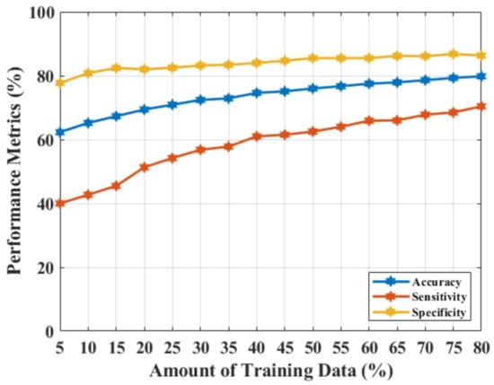 An NF and WF signal classification has been performed by employing and varying the number of PCs from 80 to 40. The obtained results are shown in Figure 5. Figure 5a–c represents accuracy, sensitivity, and specificity, respectively, for applying a different number of PCs, where the x-axis represents the amount of training data used, and the y-axis describes the magnitude of the performance metric. The accuracy, sensitivity, and specificity have improved more than before, from 79.80% to 91%, 70.40% to 84.40%, and 86.30% to 97.20%. This is the optimal performance achieved, employing 50 PCs, and a further reduction of feature length (by 10 units of PCs) slopes down the classification metrics.