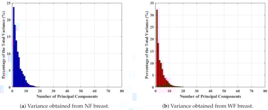 Hence, one of the most popular feature extraction principal component analysis (PCA) technique was applied on to transform more meaningful features for the classification task in a similar manner adopted to calculate the principal components (PCs) from the original complex signals of the MammoWave. Here, two vectors of variances (after PCA computation) have been selected from NF and WF breasts to study the magnitude of variance for selecting the number of PCs for the classification, as shown in Figure 4. Figure 4 shows the percentage of the total variance obtained from each PC for two different breast’s , where first 80 PCs are found to be quantitatively significant. Hence, Figure 4a,b show the percentage of variance for the first 80 PCs, where the axis and axis represent the number of components and percentage of variance, respectively. Figure 4a displays the percentage of variance of an NF breast and Figure 4b describes the percentage of variance of a WF breast. As PCs show significant variance, up to 80 PCs (, ,…, ) have been selected for classification and varied, anticipating an improved performance.