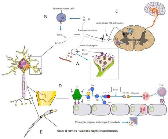 Pathogenesis of peripheral neuropathy and neuropathic pain in connective tissue disease. (A) I L-1β, IL-6 and TNF-α are sensed by nociceptors, which then leads to the release of various neuropeptides, such as calcitonin gene-related protein and substance P, resulting in vasodilatation and increased vascular permeability. (B) The mediators released from sensory neurons in the periphery attract and activate immune innate cells and adaptative immune cells, release NGF and PGE2, inducing peripheral sensitisation and hyperalgesic phenomena. (C) (1) The invasion of anti-plexin D1 antibodies in the dorsal root ganglia (DRG) on which the BBB and blood–nerve barrier are absent and binding to unmyelinated small DRG neurons (primary sensory neurons), cause neuropathic pain. (2) ET-1 (endothelin-1) causes BBB hyperpermeability and activates microglia and astroglia through the ET-1/EDNRB (endothelin receptor type B) pathway in allergic inflammation. Then glial activation triggers the activation of second-order sensory neurons in the dorsal horn of the spinal cord and induces neuropathic pain. (D) (1) Cell-mediated immunity: circulating T cells recognize antigens related to endothelial cells acting as antigen-presenting cells, Increased expression of cell adhesion molecules and release of chemotactic cytokines caused by this interaction, in turn, recruit and activate neutrophils and lymphocytes with subsequent inflammation and destruction of the vascular wall. (2) Deposition of immune complexes (IC): circulating antibodies binding to endogenous or exogenous antigens forms IC which deposits on the vascular wall and activates the complement system, then the factors C3a and C5a chemotactic for neutrophils are formed. Neutrophils could infiltrate the vascular wall, phagocyte the IC and release proteolytic enzymes and oxygen-free radicals that destroy the vascular wall. (E) Due to the substantially increased number of potential antigens and the crucial permeability of the blood–nerve barrier in nodal and juxta paranodal structures, nodes of Ranvier may be a vulnerable target for autoimmunity.