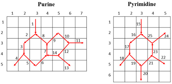 Directed cyclic graphical representations of purine (fused six- and five-membered ring conformation) and pyrimidine (six-membered ring). Individual directed paths are constructed using red arrows, which are enumerated. The initial and final points of each arrow represent the first and second parameters of the signum function for bit generation, respectively. With both structures combined, 25 bits (total number of directed paths) can be generated using 5 × 7 and 6 × 5 sized matrices (see text).
