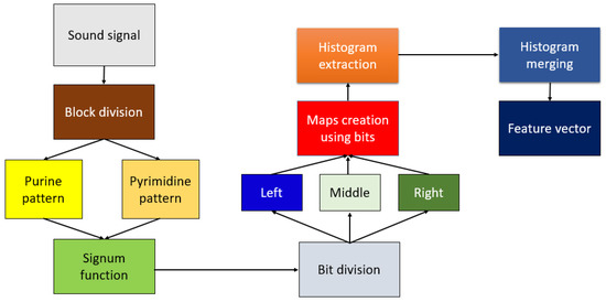 where and are the generated first, second, and third map sounds for feature generation. Histograms of these map sounds are extracted to obtain feature vectors. From Equations (5)–(9), these signals are coded with 8, 9, and 8 bits, respectively.