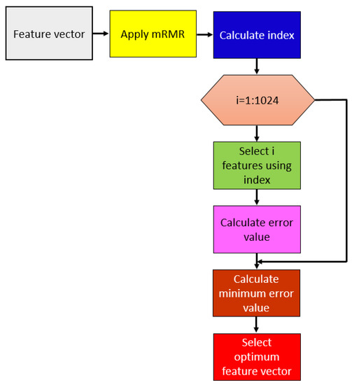 For automatic selection of the optimal number of generated features, we proposed an iterative version of the maximum relevance minimum redundancy selector (mRMR) [50], ImRMR, that incorporated an error calculator with kNN classifier. A schematic of the ImRMR selector is shown in Figure 4.