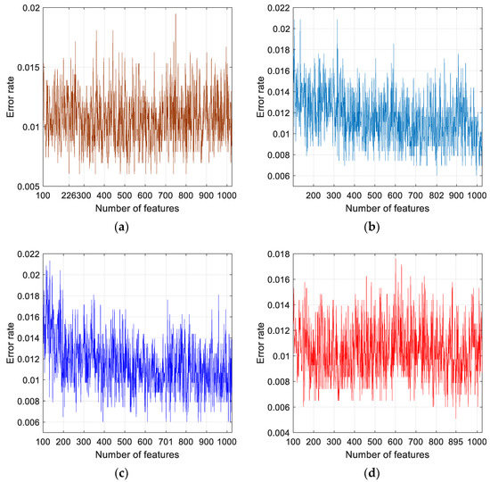 Plots of error rates versus number of features selected using: (a) iterative feature selectors IChi2, (b), INCA, (c), IRF, and (d) ImRMR implemented for Case 3.