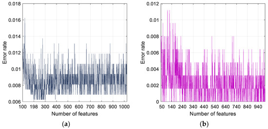 Plots of error rates versus number of features selected by ImRMR for (a) Case 1 and (b) Case 2.