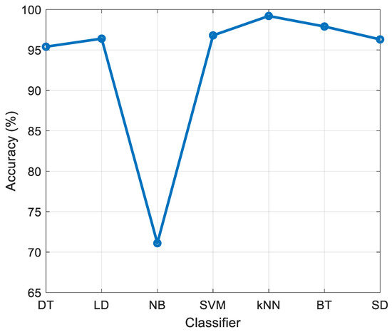 The Standard kNN classifier is employed for calculating the error rate during the feature selection phase (see Section 2.2.3) in order to obtain classification results. We have used decision tree (DT) [52], linear discriminant (LD) [53], naïve Bayes (NB) [54], support vector machine (SVM) [55], kNN [19], bagged tree (BT) [56], and subspace discriminant (SD) [57] classifiers in addition to kNN for the classification tasks using 1024 features. It can be noted from Figure 8 that the best results are obtained using the kNN classifier. Therefore, kNN is selected both as the classifier and the error/loss value generator in the features selection phase.