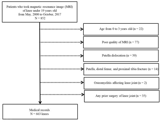 A total of 852 patients below 19 years of age who underwent an MRI of the knee joint from May 2000 to October 2017 were retrospectively reviewed. Normal knee MRI was selected using KCD-8 codes (Korean Standard Classification of Diseases) including knee contusion, knee laceration, knee pain, knee benign mass, meniscus tear, cellulitis, and knee sprain. Among them, 189 patients were excluded because of age less than three years, poor image quality, patellar dislocation, fractures involving patellofemoral joint, osteomyelitis affecting knee joint, and prior surgery of knee joint (Figure 1). The zero- to 3-year-old population was excluded due to the low sample size. Patients were divided into five groups according to age and sex (Group 1, 4–6 years; Group 2, 7–9 years; Group 3, 10–12 years; Group 4, 13–15 years; and Group 5, 16–18 years). Our institutional review board approved this study (CHAMC-2020-06-030).