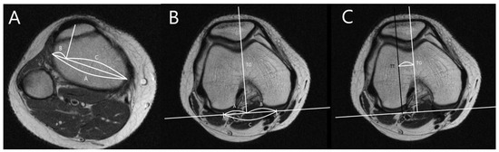 The alignment parameters of the patellofemoral joint were measured in the axial slice of the deepest trochlear groove and the most prominent tibial tuberosity [25]. The PTL, PSL, and TT-TG were measured as shown in Figure 3 [26,27].