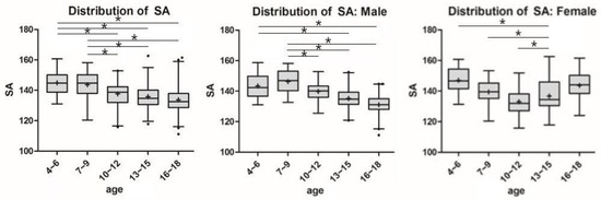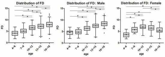Significant differences in SA and FD between age groups for each sex are shown by lines and asterisks in Figure 4 and Figure 5. In males and females, SA and FD showed similar patterns in a reverse direction. Among males, the SA decreased from the age group of 7–9 years (146.3 ± 7.4°), and the FD increased with aging. However, in the females, the SA showed a pattern of decrease, followed by an increase in the age group of 10–12 years (133.0 ± 8.1°) as the inflection point, and the FD showed the opposite pattern (6.9 ± 1.4 mm).