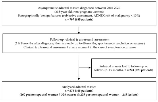 This prospective multicentric cohort study was conducted at the departments of obstetrics and gynecology—gynecological ultrasound units of two Portuguese tertiary referral hospitals (Maternidade Dr. Alfredo da Costa, Centro Hospital Universitário de Lisboa Central and Hospital S. Francisco Xavier, Centro Hospital Lisboa Ocidental, Lisbon, PT). It included ≥18-year-old, non-pregnant patients with asymptomatic adnexal masses (associated risk of malignancy <10%, as determined by the Assessment of Different NEoplasias in the adneXa (ADNEX) model) sonographically diagnosed during an arbitrarily chosen five-year period from January 2016 until December 2020. Of all the asymptomatic cases consecutively observed during this period, only patients with de novo diagnosed masses were included. If bilateral adnexal masses were diagnosed, each one of them was included and treated separately. Patients participating in other studies and those with evident physiological formations <3 cm were excluded (see Figure 1).