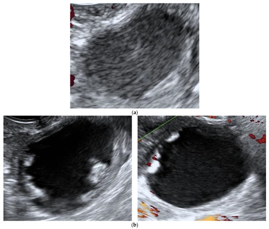 - Alcázar, J.L.; Castillo, G.; Jurado, M.; García, G. Is expectant management of sonographically benign adnexal cysts an option in selected asymptomatic premenopausal women? Hum. Reprod. 2005, 20, 3231–3234. [Google Scholar] [CrossRef] [Green Version]
