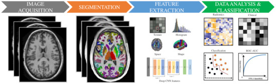 To provide a wider perspective to the readers, the radiomic pipeline is simply given in Figure 1. It illustrates the processing steps for the radiomic pipeline that consist of image acquisition and preprocessing, segmentation, feature extraction, statistical analysis, and classifications. We describe, below, a detailed review of each step.
