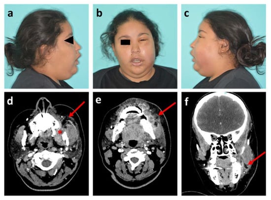Photographs and head and neck CT scan of patient 1. (a–c) Visible images of healthy right profile, front view and affected left profile, respectively; (d,e) Axial plane of CT scan in soft tissue window, at maxillary level with the socket of the tooth #28 (red star) and at mandibular level, respectively; (f) Sagittal plane of CT scan. Red arrows show the infectious collection.