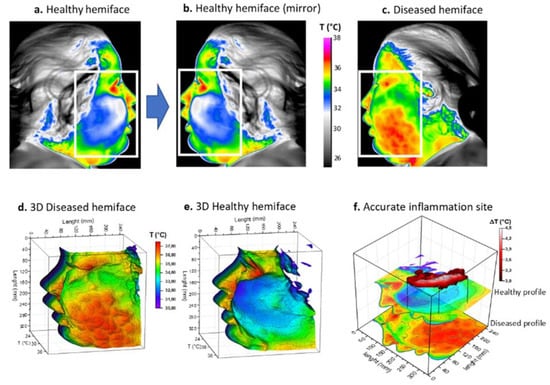 Thermal procedure in patient 2. (a) Front view visible image of the patient; (b) Returned (mirror) thermal image of the healthy hemiface with corresponding ROI; (c) Thermal image of the diseased hemiface with the same ROI; (d,e) 3D representations of the ROI weighted by temperature; (f) Resulting site of highest inflammation. White boxes correspond to the ROI.