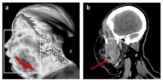 Position of the main inflammation site after thermal analysis for patient 1. (a) Resulting accurate localization of main inflammation linked to facial cellulitis with MIT; (b) Coronal plane of CT scan in soft tissue window at the level of the infectious collection (red arrow).