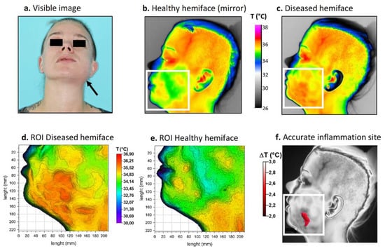 The human face lends itself well to thermographic study because all the essential areas can be analyzed [,]. Some anatomical areas have a high thermal intensity (such as the medial palpebral commissure, labial commissure, temporal, supratrochlear and external acoustic meatus), while other areas are identifiable by their low thermal intensity (such as the inferior labial, lateral palpebral commissure and nasolabial) []. Previous studies have also reported that in healthy people, temperature distribution is symmetrical between the two sides of the human body, while in diseased individuals, this thermal distribution is abnormal due to changes in blood flow []. Our work has the advantage of comparing complete anatomical areas, taking into account all the pixels of the area rather than only a few representative points, as performed in other studies []. The postprocessing procedure is based on the acquisition of thermal maps of regions of interest (ROIs) of the face, symmetrically located relative to the sagittal plane at head and neck level []. The idea was to carry out a thermal mapping to precisely determine the location of the main inflammatory site by subtracting the thermal data from the healthy hemiface to the diseased hemiface.