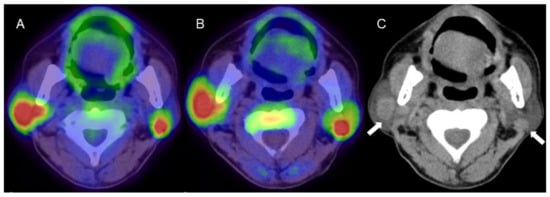 A man in his 60s with pathologically proven Warthin’s tumor in the parotid glands bilaterally. (A) Fused FDG-PET/CT image (axial view), (B) fused 4DST PET/CT image (axial view), and (C) plain CT (axial view). Intense uptake of both FDG (SUVmax: 9.6) and 4DST PET/CT (SUVmax: 12.0) is seen in bilateral nodular lesions, which show high intensity on plain CT (arrows) consistent with the typical features of Warthin’s tumors. Aspiration biopsy revealed oncocytes and abundant lymph-node cells and epithelium with eosinophilic cytoplasm, and a diagnosis of Warthin’s tumor was made based on pathological findings.