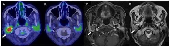 A woman in her 70s with a tumor of the right parotid gland, highly suspected to be pleomorphic adenoma (arrows). (A) Fused FDG-PET/CT image (axial view), (B) fused 4DST PET/CT image (axial view), (C) Gd-enhanced MRI (axial view), and (D) T2WI MRI image (axial view). On T2WI, a well-circumscribed intraparotid mass of intermediate-to-high signal and a low-signal rim is seen, with heterogeneous nodular enhancement, characteristic of pleomorphic adenoma []. The tumor shows increased FDG uptake (SUVmax: 5.2) but no 4DST uptake.