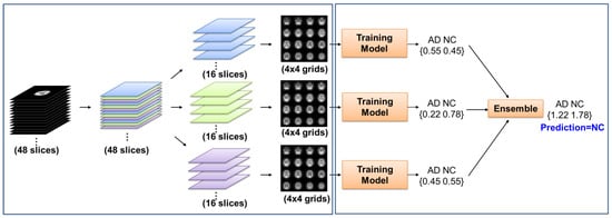Each 3D image was divided into three 2D images. The respective predicted probabilities of three 2D images from the same subject were summed for ensemble learning as shown in the right part of Figure 1.