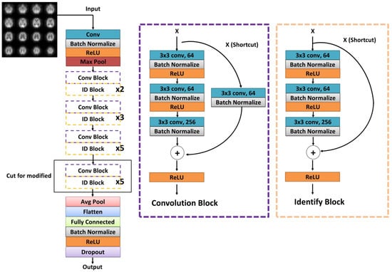 In the study, the effects of the three training methods were compared: (a) Original ResNet-50, which loaded the ResNet-50 weights trained on the ImageNet data set. In Figure 2, an average pooling was connected to the top layer of the ResNet-50 model, then the fully connected layer (FC) with a length of 128, the batch normalization (BN), and the dropout layer were added. The dropout layer was set to 0.5 as a form of regulation to avoid neural network coadaptation by randomly removing nodes for a more robust model. (b) ResNet-50 with ADNI Pretrained, which was first loaded with the ResNet-50 weights trained on ImageNet, then retrained by the F-18-FDG PET image data set, and finally retrained by the Tc-99m-ECD SPECT image data set with the weights of the aforementioned learning as the initial value. (c) ResNet-50 with ADNI Pretrained + Modified, which was the same as (b), but when transferring learning to the Tc-99m-ECD SPECT image, the model was modified to delete the high-level features corresponding to the fifth block of ResNet-50. The architecture of the training model is shown in Figure 2.