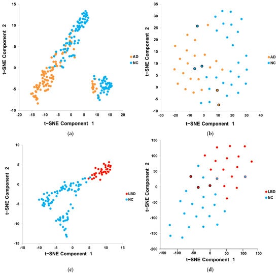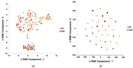 To distinguish between AD and NC, the features extracted from each Tc-99m-ECD SPECT training image after the deep learning model (“ResNet-50 with ADNI Pretrained + Modified”) are displayed by t-SNE dimensionality reduction, as shown in Figure 3a, and the NC data (blue points) and AD data (orange points) have two clusters, both of which can roughly distinguish AD and NC, which means that the characteristics of AD and NC are distinguishable after training. Figure 3b shows the feature of the images used for testing to distinguish AD and NC, with AD data in the lower left and NC data in the upper right of the figure; however, there was a partial mixing of the clusters. To distinguish between LBD and NC, the feature distributions of the Tc-99m-ECD SPECT image training and testing data sets by the “Original ResNet-50” model are shown in Figure 3c,d. Regardless of the training or testing data set, there was a clear distinguishing ability. To distinguish between AD and LBD, the feature distributions of the Tc-99m-ECD SPECT image training and testing data sets by “ResNet-50 with ADNI Pretrained” model are shown in Figure 3e,f; the trend is similar to Figure 3a,b, but the distinguishing ability is poorer.