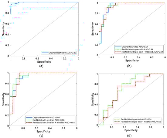 (a) ROC curve of ResNet-50 model trained on F-18-FDG PET images for AD/NC; (b–d) ROC curves of various deep learning models trained on Tc-99m-ECD SPECT images, (b) AD/NC; (c) LBD/NC; (d) AD/LBD task.