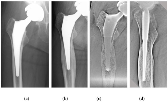 - Gillet, R.; Teixeira, P.; Bonarelli, C.; Coudane, H.; Sirveaux, F.; Louis, M.; Blum, A. Comparison of radiographs, tomosynthesis and CT with metal artifact reduction for the detection of hip prosthetic loosening. Eur. Radiol. 2018, 29, 1258–1266. [Google Scholar] [CrossRef] [PubMed]