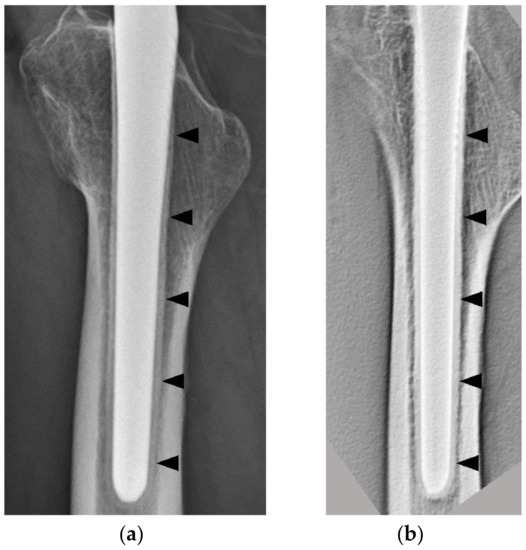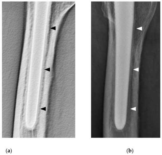 The patient cost for DTS is approximately twice compared to that of plain radiography, although less than one-third of that for CT [30,31,32]. Higher interobserver agreement has been reported with DTS than with radiography [33,34]. In this study, as shown in Figure 3, some cases of the SBF could be easily observed on plain radiographs. However, there were several cases that appeared to be stem loosening, and overestimation on plain radiographs has a significant impact on surgical outcomes and subsequent treatment strategies. Certainly, this does not change the usefulness of plain radiograph diagnosis, and the initial cost of installing a machine must be taken into consideration. However, we were able to demonstrate the usefulness of DTS as a diagnostic aid.