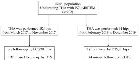 Patients who underwent primary THA with the POLARSTEM, described later, at our institution were included in this cross-sectional study. Patients who had undergone previous surgery on the same joint were excluded (Figure 3).