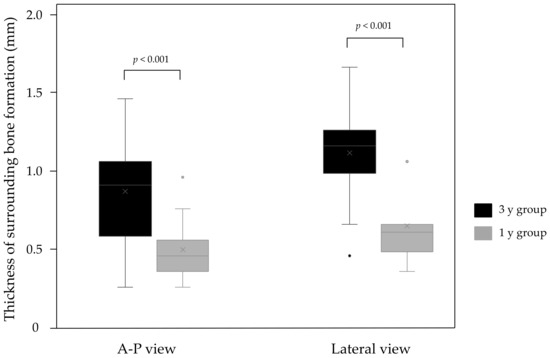 In the AP view, the thicknesses of the osteogenic layer were 0.54 ± 0.19 and 0.91 ± 0.31 mm in the 1 y group and 3 y group (p < 0.001), respectively, and there was a significant difference. In the lateral view, the thicknesses of the osteogenic layer were 0.69 ± 0.20 and 1.16 ± 0.27 mm in the 1 y group and 3 y group (p < 0.001), respectively, and this was also significantly different (Figure 5). No RLs with osteopetrosis in either group were noted.