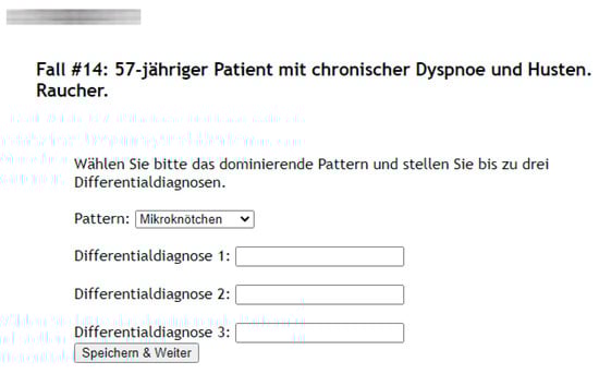 To document the study participants’ reading results we created a web-based case presentation and answer sheet in the German language. For each case it features a short patient history consisting of the age and sex as well as cardinal symptoms (e.g., dry cough and dyspnea) and relevant information such as if the patient is a smoker (Figure 1).