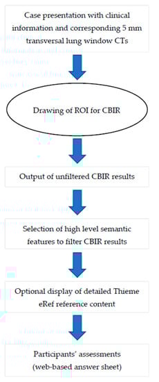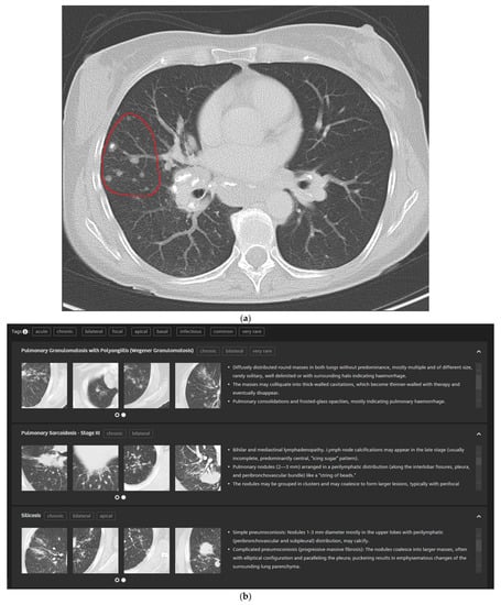 To date, myriads of radiological searches have one root—Radiopaedia. Therefore, most radiologists will have come along this dictionary’s definition of interstitial lung diseases as “an umbrella that embraces a broad spectrum of disorders that are characterized by diffuse cellular infiltrates in periacinar location” []. More than 200 various lung disorders [] from acute diseases (e.g., acute exacerbation UIP []) to more chronic fibrotic illnesses (e.g., sarcoidosis []) and most recently Post COVID-19 fibrosis [], are represented in the family of interstitial lung diseases, most of which are very rare []. They often present with overlapping pathological, radiological and clinical features [] as “chronic, progressive fibrosing interstitial pneumonia of unknown cause (…) characterized by progressive worsening of dyspnea and lung function” []. High-resolution CT (HRCT) plays a vital role in the diagnosis of interstitial lung diseases. For example, in the correct clinical context, when HRCT pattern is suggestive of usual interstitial pneumonia (UIP), surgical lung biopsy is not mandatory for a diagnosis of idiopathic pulmonary fibrosis (IPF) [,]. For the diagnosis and subsequent treatment of patients with interstitial lung disease (ILD) accurate pattern recognition on computed tomography (CT) images plays a vital role []. Correct and early diagnosis is crucial for deciding on the right treatment and presents a challenge, especially for novices. Therefore, advancements in computer-aided pattern recognition can improve the diagnostics of ILDs, make it accessible to non-academic centers and have the potential to cut down the costs spent on the social and healthcare aspects of the diseases []. Computer-aided diagnosis systems (CAD) (and CADs that utilize content-based image retrieval (CBIR)) have already been established in radiology such as in the detection of breast cancer in mammography or MRI [,,], in the detection of lung metastases in MDCT images [], or in the characterization of liver lesions in CT scans [] just to name a few. With the recent emergence of artificial intelligence algorithms, likely to be one of the most promising advancements in the history of medicine [], these have led to astonishing progress in image-recognition tasks and may someday even supersede human performance in complex tasks []. In fact, CADs have already been developed for the automatic classification of HRCT images []. In the present however, AI-like CAD systems are only used as a supplementary aid for the radiologists’ subjective image assessment []. Therefore, the performance of CADs is depending on the users’ knowledge and experience and has been shown to successfully assist even novice readers []. Regarding ILDs, while CADs have shown promising results such as good accuracy in detecting fibrosis on a quantitative level [] and good performance in distinguishing between specific diseases such as UIP and non-specific interstitial pneumonia (NSIP) [], current systems are usually limited in the number of different ILDs they comprise of and patterns they recognize. Given the challenges and implications of correctly diagnosing both common and rarer ILDs and identifying their underlying radiological pattern, we evaluated a novel CBIR for the differentiation of interstitial lung diseases that offers reference cases of 79 different lung diseases and featured the use of high-level semantic features.