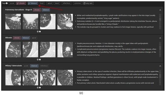 In detail, the participants drew a ROI into their perceived representative pattern in each case which was then analyzed by the CBIR (Figure 3a). The readers are then presented with the CBIR results (Figure 3b). To further improve the retrieval results the CBIR features the possibility to input clinical information in the form of high-level semantic features (e.g., smoking, infectious, chronic etc.) (Figure 3c).