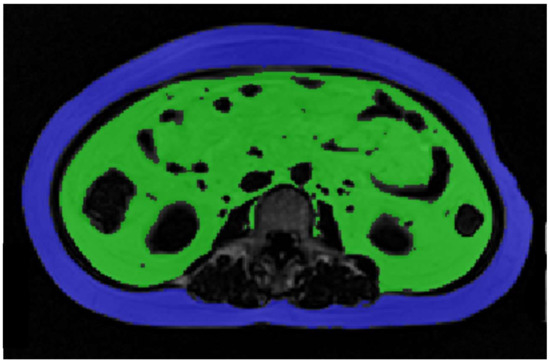 Slice at the level of the third lumbar vertebra, images acquired from the participant with unusually high levels of VAT (green color). SAT is shown in blue. Abbreviations: SAT: Subcutaneous adipose tissue, VAT: Visceral adipose tissue.