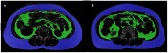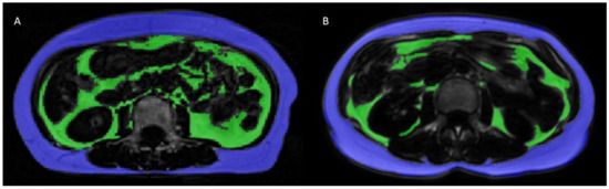 SAT and VAT volumes were extracted from the water- and fat- separated images of the two-echo Dixon scans, using a custom-built semi-automatic post-processing algorithm (http://doi.org/10.5281/zenodo.3545989 accessed on 1 June 2021) [40,41]. The area of interest was defined as the region from the liver dome to the middle of the femoral head. Segmentations resulting from the algorithm were adjusted slice-by-slice manually by one researcher per ethnic group (M.K. for the Singaporean group and D.J. for the Caucasian group), to exclude non-VAT compartments (e.g., intermuscular, around the spine) and thoracic fat from the quantification [42]. The two researchers initially agreed on a common approach in order to perform the manual corrections in the segmentations in consensus. The volume of each compartment was calculated as the total number of pixels multiplied by the voxel size (slice thickness × pixel width × pixel depth). The total adipose tissue (TAT) of the analyzed area was calculated as the sum of SAT and VAT [43].