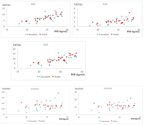 In the present analysis, there was a linear trend between absolute measurements of fat and BMI in both cohorts. The same was observed for the ratios VAT/SAT and VAT/TAT in the Caucasian, but not the Asian, cohort. In a study that did not include Asian subjects, BMI has been found to have a linear relationship with visceral fat accumulation in African-American, Hispanic-American, and Caucasian women, with the relationship being stronger in the Caucasian group [14]. The present finding that in the Asian group VAT/SAT and VAT/TAT ratios are not correlated with age and BMI furthermore adds to the observations of obesity-related diseases reported in Asian populations at lower BMIs compared to other racial groups [44,45].
