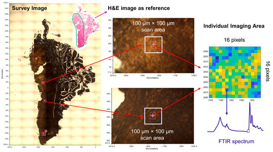 In the current study, a traditional Perkin Elmer FTIR spectrometer and imaging system (Spectrum one, Spotlight 300, Perkin Elmer, Waltham, MA, USA) with the spectral resolution of 4 cm−1 and spatial resolution of 6.25 µm was used. The current FTIR image acquisition and spectral preprocessing protocols generated good quality spectra in a reasonable time frame. Further improvements in spatial resolution and spectral quality can be achieved with added lenses, high-resolution infrared microscope optics, computational algorithms, and quantum cascade laser imaging systems, which offer advantages over traditional FTIR systems with respect to the speed of acquisition and field of view [53].