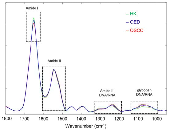 Figure 3 compares the class-average spectra for the HK, OED, and OSCC samples. Specifically, the class average spectra were calculated from 24 representative spectra of HK samples (green), 22 representative spectra of OED samples (blue), and 22 representative spectra of OSCC samples (red), respectively. Based on visual observation, the spectral differences are mainly located in four spectral regions: the region around 1650 cm−1, the region of 1600–1500 cm−1, the region of 1350–1180 cm−1, and the region of 1160–950 cm−1. The 1650 cm−1 band is the amide I band of protein, which is mainly associated with the C=O stretching vibration in the peptide backbone structure [35]. The results show a descending band intensity in the order of HK > OED > OSCC for the amide I band. The 1600–1500 cm−1 region is the amide II band of the protein, which is mainly associated with the bending vibration of the N-H bond and the stretching vibration of the C-N bond in the peptide backbone [35]. The results show a descending band intensity at 1548 cm−1 in the order of HK > OED > OSCC and a red shift toward lower wavenumbers on the right shoulder of the amide II band for the OSCC and OED spectra (more shift for OSCC than OED). The spectral region of 1350–1180 cm−1 can be attributed to the amide III band of protein (1350–1250 cm−1), which is mainly from N-H bending and C-N stretching vibration, to the asymmetric vibration of –PO2− (1240 cm−1), and to the deformational modes of the CH3/CH2 groups in phospholipid and nuclei acids [36,37]. The results show a descending band intensity at 1310 cm−1 in the order of HK > OED > OSCC and at 1240 cm−1 in the order of OSCC > OED > HK. The spectral region of 1160–950 cm−1 can be attributed to the stretching vibrations of the C–O/C–C groups in the carbohydrate (e.g., glycogen) (1154 and 1030 cm−1) and to the symmetric vibration of –PO2− in the phospholipid and nucleic acids (1080 cm−1) [14,38]. The results show a descending band intensity in this region in the order of OSCC > OED > HK.