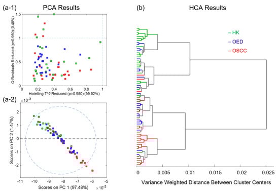 Figure 4 shows the exploratory analysis results for all 68 representative spectra. (a-1) shows the reduced Hotelling T2 versus Q residuals graph of PCA; (a-2) shows the score plot for PC1 and PC2; and (b) shows the HCA dendrogram graph. Both the PCA and HCA results showed good but not ideal separation between the HK and OSCC representative spectra. The OED representative spectra overlap with both the HK and OSCC representative spectra.