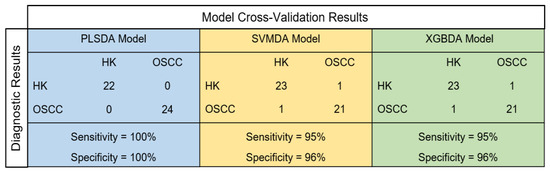 Figure 5 summarizes the cross-validation performances of the three machine learning models built in the current study (PLSDA, SVMDA, and XGBDA) for discriminating the OSCC from HK samples. The PLSDA model showed a 100% sensitivity and 100% specificity, while both the SVMDA and the XGBDA models showed 95% sensitivities and 96% specificities.