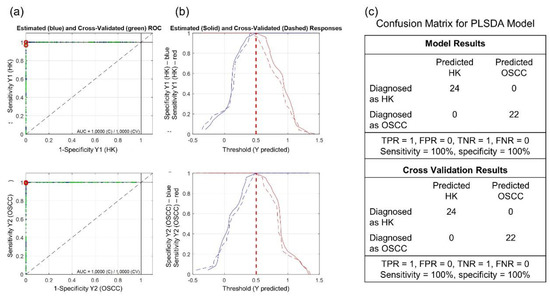 Figure 7 shows (a) the ROC curves and AUC values, (b) the sensitivity and specificity curves, and (c) the confusion matrix for the PLSDA model. The AUC for calibration and cross-validation were both 1, and the sensitivity and specificity were both 100% at a threshold of 0.5 for the HK and OSCC samples. The results indicate a perfect discriminant model for the experimental HK and OSCC spectral data.