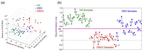 Figure 8a shows the PLSDA model score plot for the top three latent variables (LV1–LV3) for all 68 representative spectra. Figure 8b visually summarizes the discrimination results for all 34 samples. The dashed purple line in the middle is the discrimination line of the PLSDA model. Two representative spectra connected with a solid line came from the same sample—a longer line suggests higher intra-sample spectral heterogeneity, while a shorter line suggests lower intra-sample spectral heterogeneity. The results show a complete discrimination between all of the HK samples and OSCC samples. For the OED samples, D-2, D-3, D-5, D-7, D-9, and D-11 were classified as “HK-grade”, indicating more spectral similarities between the six OED samples and the HK samples; D-1, D-4, D-6, and D-8 were classified as “OSCC-grade”, indicating more spectral similarities between the four OED samples and the OSCC samples. The two representative spectra of the sample D-10 were located in the vicinity of both sides of the discrimination line, indicating a borderline classification case.