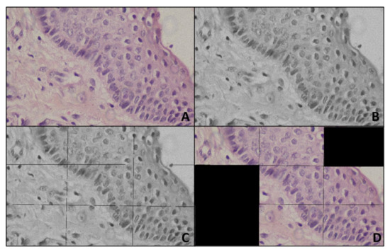 In the images two regions were majorly observed, the epithelial region and connective tissue region. The epithelial region of OKC had distinct features such as a palisading pattern of basal cells and parakeratinized surface which distinguishes from DC and RC, so here an attempt was made to retain only the epithelial region and remove the connective tissue region. The images were titled into nine patches, each patch of resolution 1280 × 720. The variance was calculated on each patch, the average was calculated over the variance values obtained, and the region with the variance less than the average was marked as connective tissue region. To confirm the connective tissue region, on the same patch, average intensity is calculated after converting into grayscale, then histogram was plotted for each patch. If the histogram had more values for the intensity above the average intensity, then this confirms the patch belongs to connective tissue. The confirmed patches pixel values were made zero. These tiles were concatenated again to get the original resolution (Figure 2).