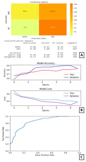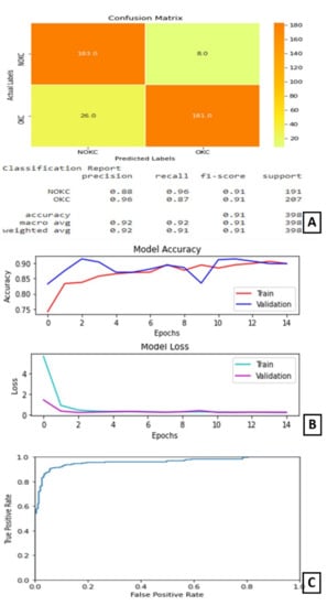The plot of accuracy on training and validation data is as shown in Figure 5B. From this plot, we can find that the accuracy of the model for training and validation data converged and is stable at the end of 15 epochs, which indicates that the model is not overtrained and, also, did not overfit. The plot of loss on training and validation data is as shown in Figure 5B. From this plot, we can find that the loss of the model for training and validation data reduced as the training progressed. It converged after a few epochs and became stable later on. The confusion matrix and classification report are shown in Figure 5A. From the confusion matrix, we can understand that the number of true positives for this model is 181 out of 207 positive samples. The ROC curve is shown in Figure 5C.
